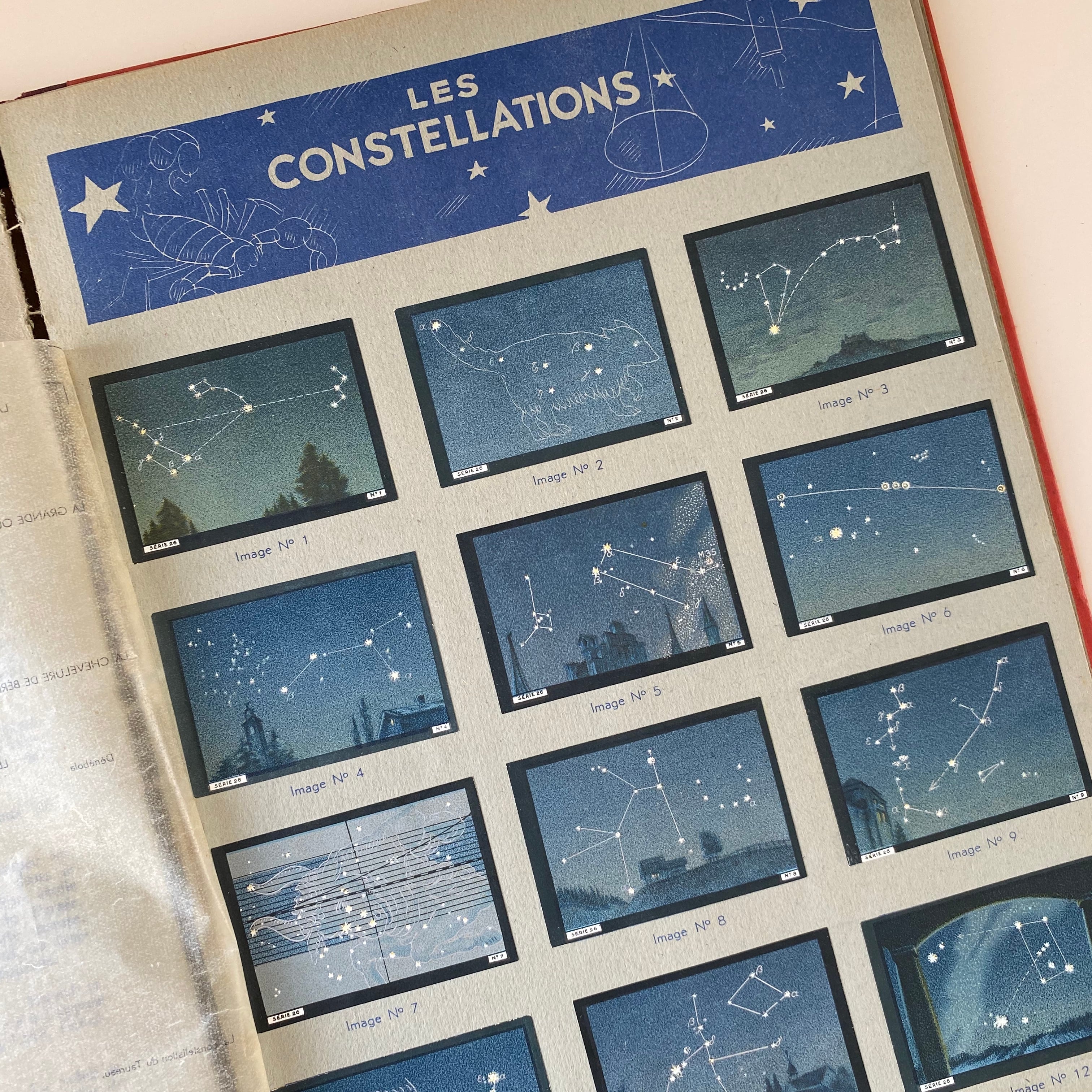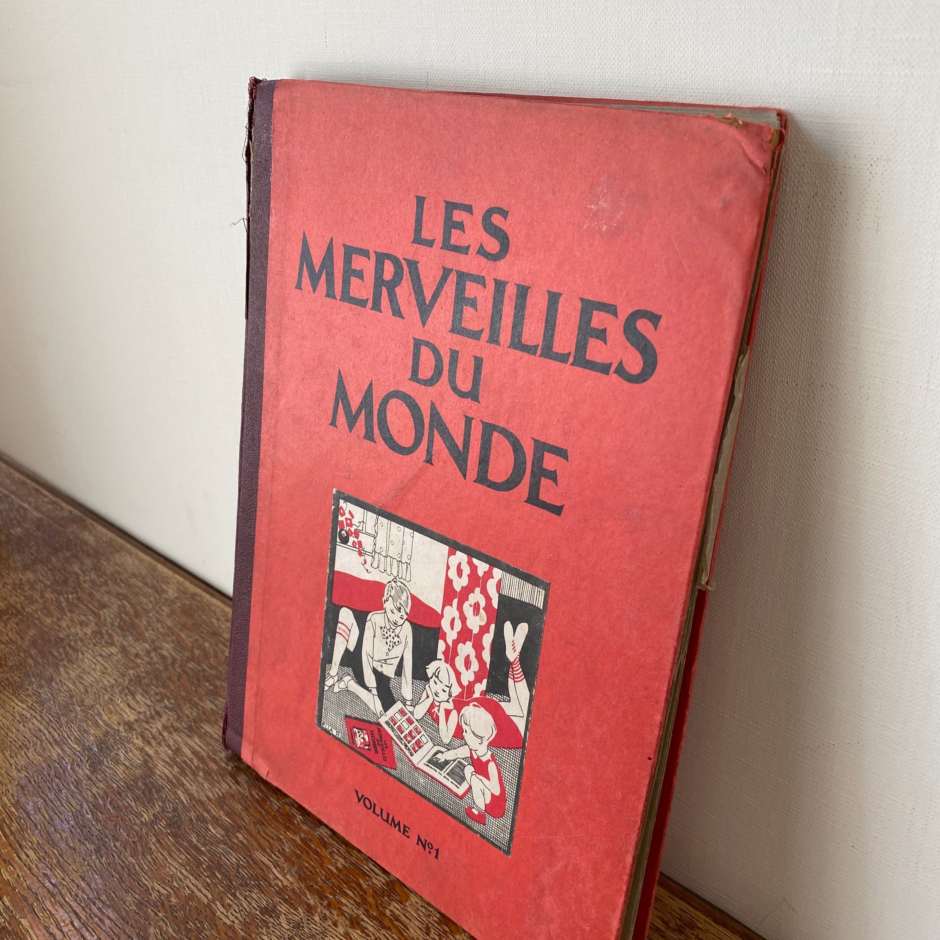 Nestléのチョコレートのおまけカードを集めて貼ったアルバム「Les Merveilles du Monde 」のNo.1。1931年のものです。おまけカードは様々な分野に渡り、決められた場所に貼るることで、小さな百科事典が出来上がります。こちらは、全てのカードがコンプリートされた完全版です。(9枚目の画像が目次ページになっており、テーマが記載されています。)